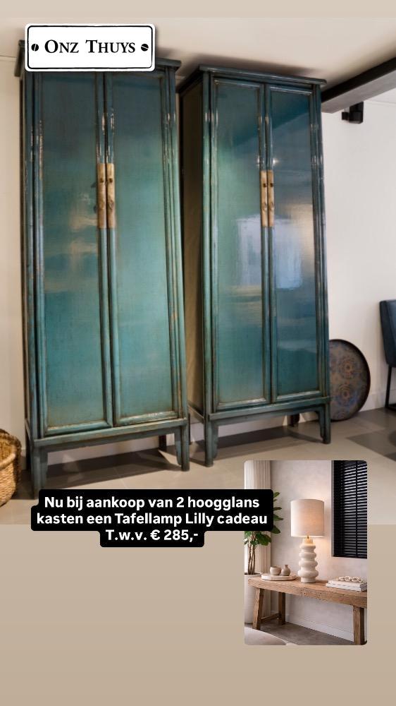 Nu bij aankoop van 2 hoogglans kasten Babs een Tafellamp Lilly met kap cadeau! t.w.v. € 285,-