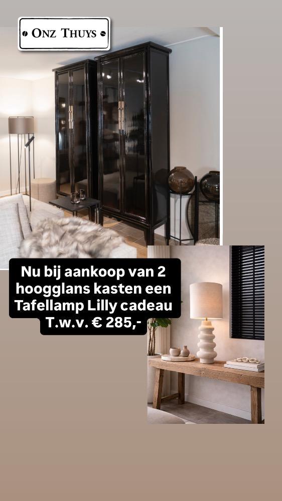 Nu bij aankoop van 2 hoogglans kasten Babs een Tafellamp Lilly met kap cadeau! t.w.v. € 285,-